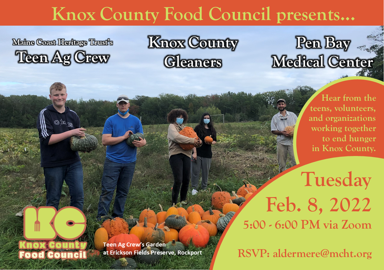 Knox County Food Council invites the public to a virtual gathering on Tuesday, February 8th to learn about an ongoing collaboration among a land trust, gleaning group, and hospital to increase food security in Midcoast Maine. The presentation will begin at 5 PM and feature farm manager Aaron Englander and the Teen Ag Crew at Maine Coast Heritage Trust’s Erickson Fields Preserve; Lorain Francis, Program Director of Penquis Community Action Program and coordinator of the Knox County Gleaners; and Deidre Dority, Let’s Go! Program Coordinator for Pen Bay Medical Center and Waldo County General Hospital.