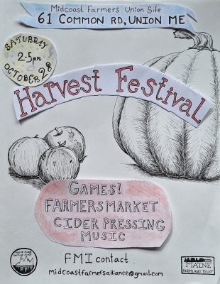 The Midcoast Farmers Alliance is hosting a Harvest Fest at the Midcoast Farmers Union Site on October 28th from 2-5pm. Community members and farmers are all invited to join in on the festivities. The event is free and open to the public and will take place at the Midcoast Farmers Site located at 61 Common Road in Union.