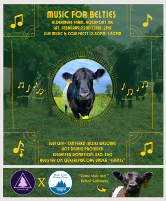 Join Queerly ME in partnership with Aldermere Farm for our first Music For Belties event February 22nd 12pm to 2pm. Live music will be played for both humans and the belted galloway herd from 12:30pm to 1:30pm. In between sets of songs, we will share some fun facts about the herd! Folks are encouraged to socialize before and after the musical portion of our event. This space is LGBTQIA+ centered and allies are welcome as well.